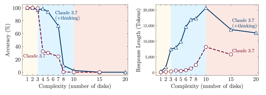 Finally, for both large language models and large reasoning models, the researchers found that beyond a certain complexity threshold, model performance collapses. For example, when the researchers used Claude 3.7 to solve the disk task, the large language model by itself was able to conduct the task with only three disks, but it was unable to do it with any more than three. The large reasoning model version could do up to six, but beyond that, its performance collapsed, too.