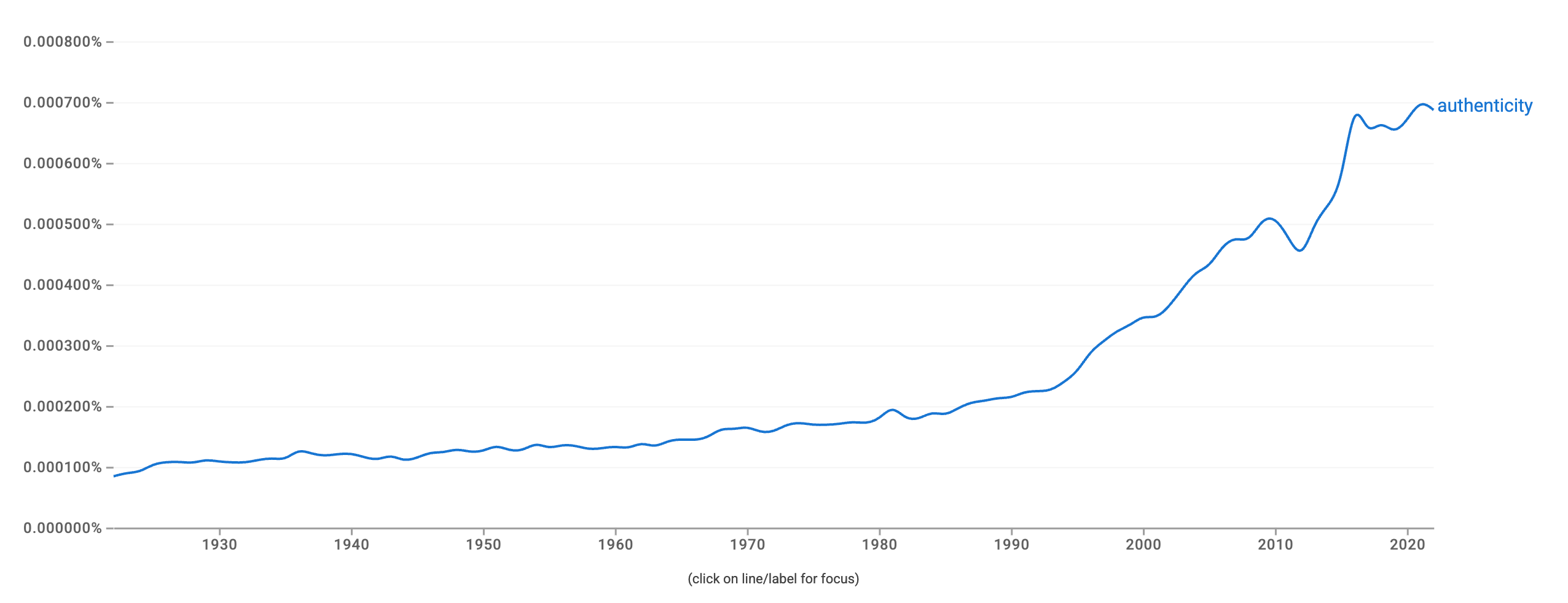 Usage of this word, “authenticity,” has grown rapidly over the last couple of decades. According to Google NGram data, the term was almost nonexistent one hundred years ago, and its usage has ballooned in the first quarter of this century. (For a brief overview of how Google Ngram works, you can look at an earlier Views Expressed newsletter called “A Visual History of AI”).