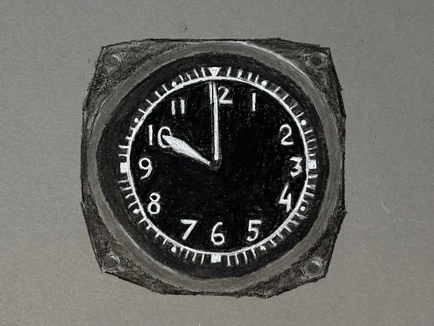 First things first: this newsletter is a labor of love and sometimes, producing the text, the audio, and the sketch is a lot to accomplish each week. This week, I almost didn’t get it done. So I did what any normal person would do in 2025, I turned to ChatGPT. I fed the model about a dozen of my sketches and then asked it to produce an image of an aircraft clock in the style of my own charcoal sketches. It did a good job. It did a great job, actually. Well, fortunately for you (and for my integrity as an artist), my flight was delayed, so I did have time to finish my own charcoal sketch of the aircraft clock.